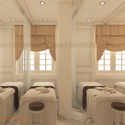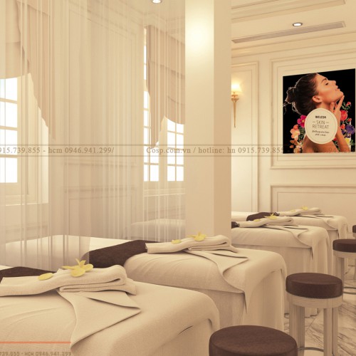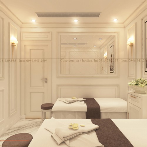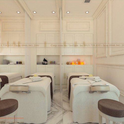 Lựa chọn gam màu chủ đạo là màu trắng trang nhã, thiết kế spa Mimosa trở nên sang trọng, thanh lịch, đầy quý phái mang đậm phong cách tân cổ điển. Đây là một trong những phong cách rất được ưa chuộng khi thiết kế spa.
