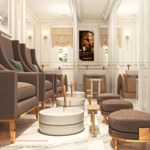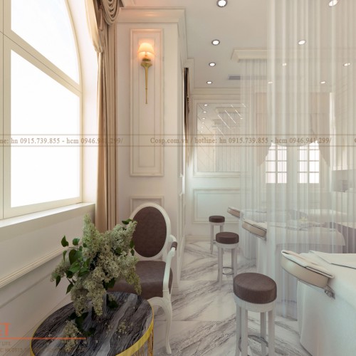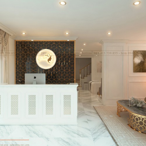 Không gian tầng trệt của spa Mimosa được dành trọn làm nơi đón tiếp và tư vấn ban đầu cho khách hàng. Bởi vậy, quầy thu ngân được làm bằng gỗ MDF chống ẩm bền đẹp và có tính thẩm mỹ cao. Chúng tôi sử dụng tone màu trắng cho quầy kết hợp với bộ ghế sofa cực kỳ sang trọng đã giúp cho không gian đầu tiên tạo ấn tượng tốt cho khách hàng. Việc thiết kế sofa và bàn trà phù hợp với phong cách tân cổ điển là rất cần thiết. Nó giúp mang lại sự nhất quán trong thiết kế và thể hiện sự chuyên nghiệp của spa.