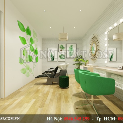 Màu sắc chủ đạo của không gian spa đó là xanh lá và trắng. Đây là hai màu sắc tươi sáng và mát mẻ giúp không gian như được mở rộng, thông thoáng hơn. Với không gian tràn ngập sắc xanh cộng hưởng với những hệ cây cảnh đem lại cảm giác thoải mái dễ chịu.