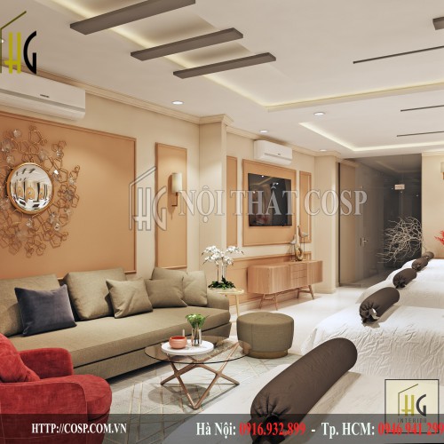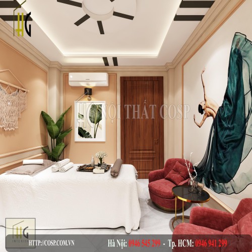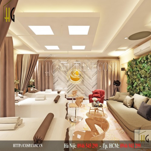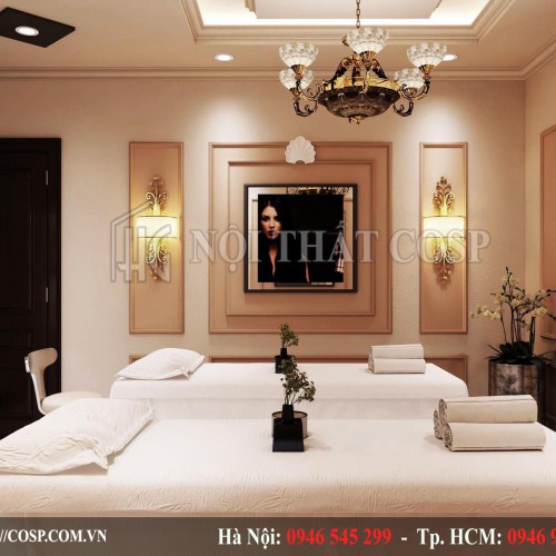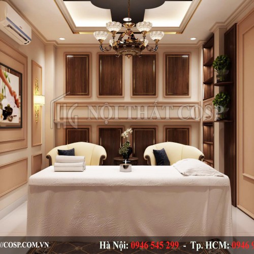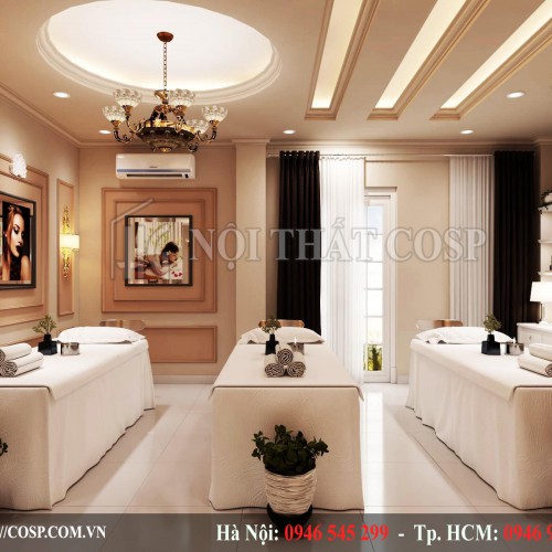 Các đồ nội thất đều được chú trọng từng chi tiết nhỏ như tường, trần, hệ thống đèn chiếu sáng. Các chi tiết này mang lại cho ta không gian phòng spa sự sang trọng.