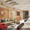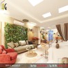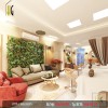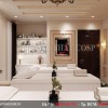 Với diện tích khá rộng, chúng tôi lựa chọn phong cách sang trọng và hiện đại, đẳng cấp đến từng khu vực và không gian khác nhau. Hai bộ sofa màu ghi bọc nỉ sang trọng êm ái có thể giúp khách hàng thư giãn và nghe nhân viên tư vấn. Bàn trà tròn, mặt kính có chân inox nhỏ gọn cho khu vực tiếp khách.