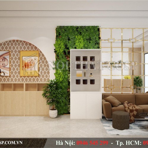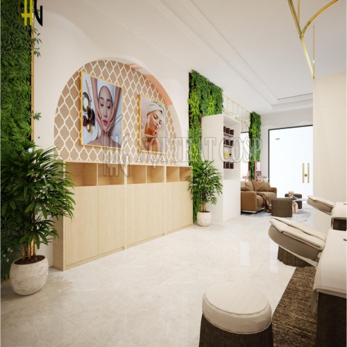 Đến với công ty nội thất COSP, chị Dung mong muốn có cho mình một không gian spa với phong cách hiện đại và sang trọng. Nhằm mang tới một không gian gần gũi với thiên nhiên, chúng tôi thiết kế nhiều hệ cây cảnh với màu sắc chủ đạo là trắng, vàng và xanh vô cùng trang nhã và bắt mắt.
