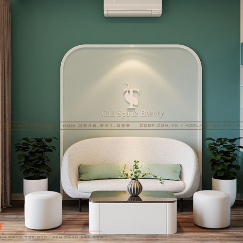 Bước chân vào spa Sáu Cali, bạn sẽ nhìn thấy bộ bàn ghế tiếp khách màu trắng sang trọng ngay cửa ra vào. Phía sau bàn ghế là vách logo có sự đồng điệu màu sắc với biển hiệu bên ngoài. Màu sắc trắng xanh đan xen tạo cảm giác thoải mái, dễ chịu cho người nhìn.