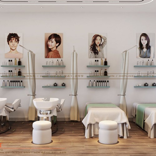 Đối diện giường nằm chăm sóc tóc là các ghế ngồi nhỏ xinh với thiết kế đẹp mắt. Tại đây, chị em sẽ được nhân viên phục vụ sấy khô tóc và tạo kiểu sau khi gội. Đối với khu vực này, PenViet sử dụng các hệ tủ nhỏ để đựng dụng cụ hỗ trợ tạo sự gọn gàng, ngăn nắp.