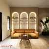 Góc bên trái spa là góc decor mỹ phẩm của spa. Vách decor cũng sử dụng các chi tiết đường cong mềm mại để tạo điểm nhấn thu hút ánh nhìn. Tại đây, chủ spa có thể trưng bày nhiều món hàng mỹ phẩm để kích thích nhu cầu mua sắm, tăng doanh thu.
