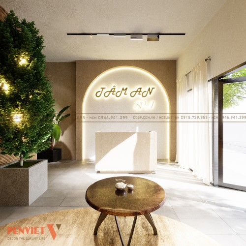 Bên trái của cửa ra vào là quầy lễ tân tiếp đón khách hàng đến với spa Tâm An. Quầy được làm từ chất liệu gỗ MDF cốt xanh chống ẩm phủ Melamine và sơn hiệu ứng cát vàng Safari. Phía sau là vách logo hình mái vòm có phủ đèn LED chạy viền đẹp mắt, bừng sáng không gian. Có sự đồng nhất khi PenViet sử dụng bộ chữ thương hiệu trên vách logo giống với mặt tiền spa.