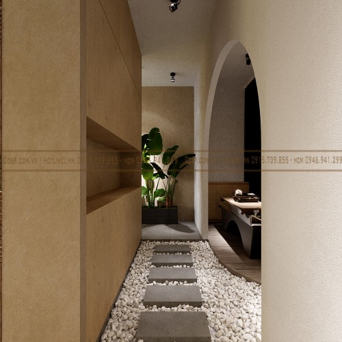 Tiếp đến là khu vực gội đầu của spa Tâm An, nơi chăm sóc sắc đẹp cho khách hàng. Để đến được không gian này, quý khách sẽ được dẫn lối đi theo hành lang thiết kế độc đáo như tiểu cảnh sân vườn. Với đá lát nền, sỏi trắng tạo nên nét đặc trưng tăng thêm phần tò mò muốn khám phá cho khách hàng.