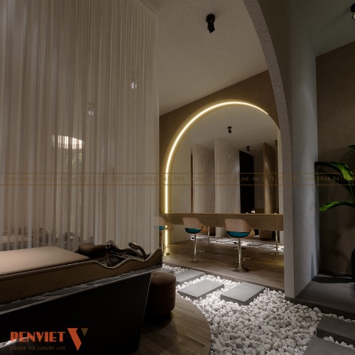 Ngoài ra, tại đây bố trí giường gội đầu có rèm che mang tính riêng tư. Khách hàng sẽ cảm thấy thoải mái hơn khi không làm phiền bất cứ ai đang trải nghiệm dịch vụ hoặc ngược lại. Đây chính là sự tinh tế của các kiến trúc sư PenViet khi thiết kế nội thất spa. Gam màu chủ đạo không gian này là nâu trầm truyền thống, nhã nhặn.