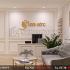 Tấm biển biển thương hiệu có chứa logo Thanh Hằng màu vàng tượng trưng cho sự quý phái nhìn rất sang trọng. ngay dưới đó, bạn có thể nhìn rõ chiếc tivi và bộ ghế sofa xanh nổi bật giữa phòng khách.