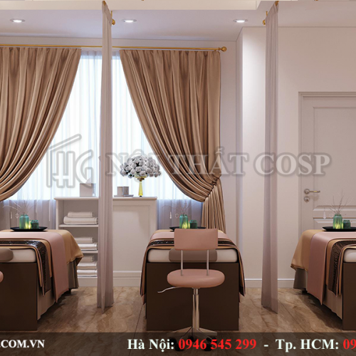 Đối với phòng massage, nội thất được sử dụng để thiết kế spa đơn giản nhưng bởi chất liệu cao cấp đã làm cho không gian có vẻ đẹp quyền quý. Những tấm rèm không chỉ giúp cho từng khách hàng một không gian riêng tư để thư giãn mà còn đẩy sự uyển chuyển, dịu êm lên cao.