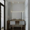 Khu vực lavabo rửa tay sử dụng hệ tủ gỗ màu nâu cánh gián đẹp mắt. Kết hợp gương soi và đèn LED hắt sáng tăng thêm vẻ đẹp đầy mê hoặc.