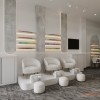 Tiếp đến là bàn ghế tiếp đón khách đến với spa Thùy Nguyễn. Bộ sofa màu trắng đồng điệu tổng thể với kiểu dáng gọn gàng tiết kiệm diện tích. Ngay phía sau là vách logo thương hiệu giúp ghi dấu ấn thêm cho khách hàng đến với spa.