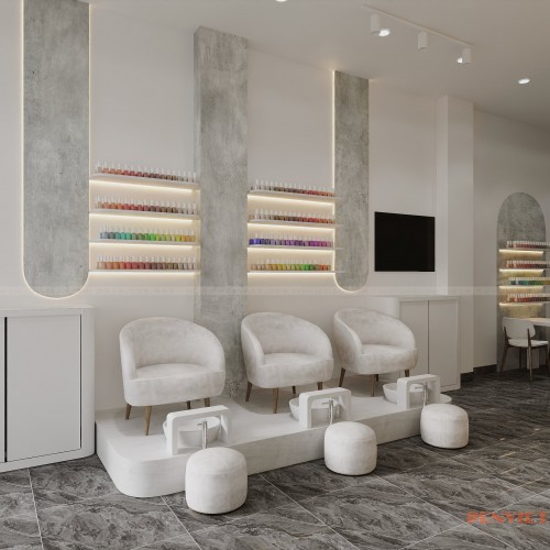 Góc bên trái của lối ra vào là khu vực chăm sóc nail. Các ghế ngồi được đặt trên bục cao bằng gỗ MDF giúp nhân viên phục vụ khách dễ dàng và thuận tiện hơn. Đặc biệt, phía sau diện tường là hệ tủ kệ trưng bày các sản phẩm sơn móng tay chuyên nghiệp, kiểu dáng đơn giản nhưng chắc chắn.