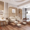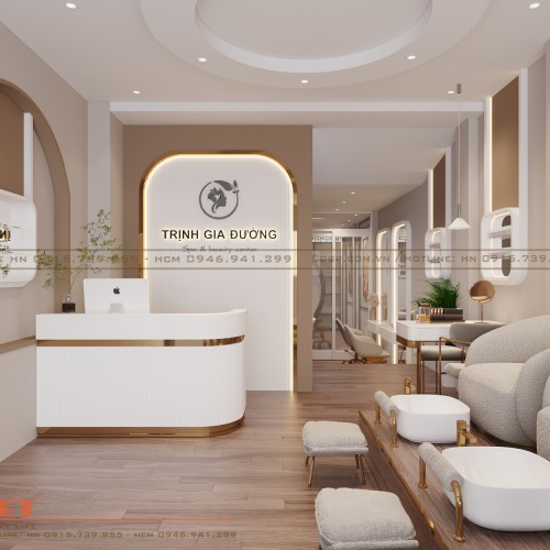 Tiếp đến là quầy lễ tân để hỗ trợ khách hàng có nhu cầu sử dụng dịch vụ khi đến spa Trịnh Gia Đường. Quầy lễ tân có thiết kế bo tròn, có các nẹp viền inox vàng gold nổi bật tạo hiệu ứng bắt sáng ấn tượng.