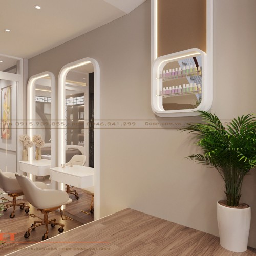 Nền nhà tầng 1 của spa được thiết kế phân 3 cấp theo từng khu vực khác nhau. Trong đó, khu vực tiếp giáp cầu thang bộ được thiết kế nền nhà thấp nhất và được setup bàn trang điểm có gương soi phục vụ khách hàng có nhu cầu.