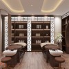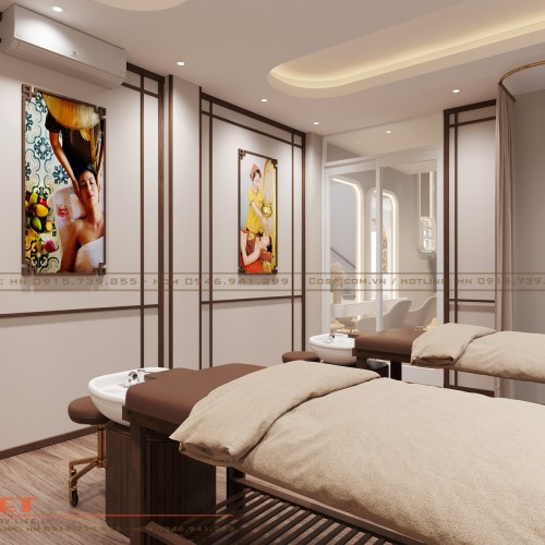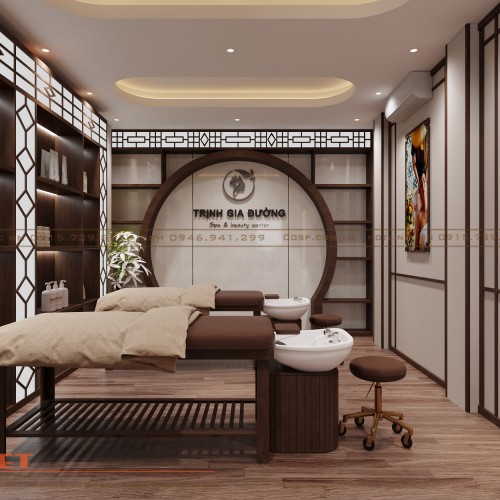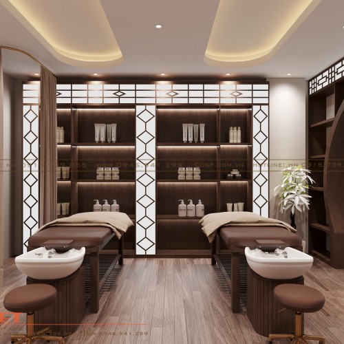 Tiếp đến là khu vực phòng gội đầu dưỡng sinh của thiết kế nội thất spa Trịnh Gia Đường. Phòng gội đầu được bố trí 2 ghế nằm đạt yêu cầu về diện tích bố trí theo tiêu chuẩn. PenViet sử dụng gam màu nâu gỗ trầm ấm áp cho không gian phòng gội đầu này tạo sự thoải mái, dễ chịu cho khách hàng.