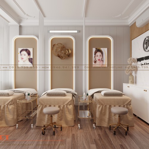 Ngay khi bước chân vào spa, bạn sẽ nhìn thấy khu vực bàn trà tiếp đón khách và nơi làm nail. Hai khu vực này được thiết kế riêng biệt trên chiếc bục bằng gỗ MDF bền bỉ cao khoảng 20cm nhằm mang đến sự thuận tiện cho nhân viên spa. Quý khách có nhu cầu làm nail chân, chăm sóc chân sẽ được nhân viên thực hiện ngay tại khu vực này.