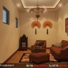 Giữa trần được thiết kế thêm đèn trùm trần cổ điển trang trí cho không gian tại phòng tiếp khách thêm độc đáo. Ngoài ra, quanh phòng được trang trí thêm những chậu cây cảnh và một số bức trang treo tường và quạt trang trí.
