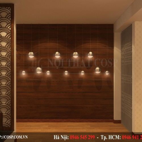 Phía trước đối diện quầy lễ tân được thiết kế tấm gỗ lớn áp trực tiếp trên tường kết hợp cùng hệ thống bóng đèn dây được đặt hình sóng dẫn dắt khách hàng đi vào phía bên trong đi vào các phòng khác của spa.