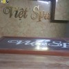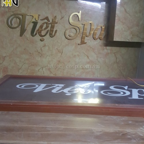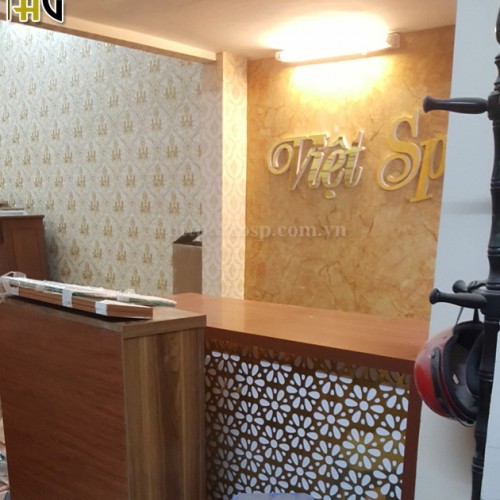 Đằng sau bàn lễ tân chính là biển thương hiệu lớn được thiết kế phía trên tên thương hiệu Việt Spa là biểu tượng hình bông hoa sen. Thiết kế nội thất spa được lựa chọn vật liệu là chữ mica phát sáng đã làm nổi bật tên thương hiệu trên nền biển màu vàng nâu.
