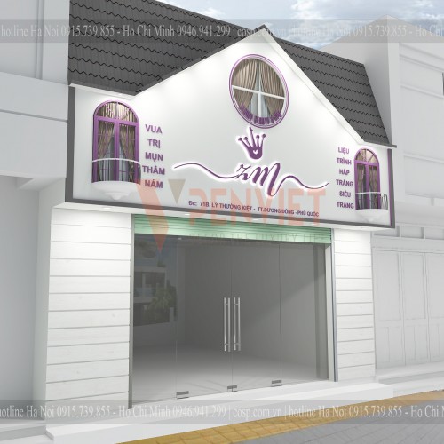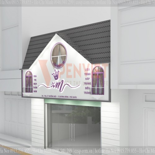 Cửa tiệm anh Nam nằm ở vị trí rộng rãi, thoáng đãng kết hợp với tone màu trắng - tím nổi và cách trang trí spa độc đáo mới lạ. Bảng hiệu được thiết kế hình dáng mái nhà, điểm xuyết những ô cửa sổ và font chữ uốn lượn tinh tế. Địa chỉ và những dịch vụ của spa cũng được cung cấp ngay khi khách hàng bắt gặp từ cái nhìn đầu tiên.