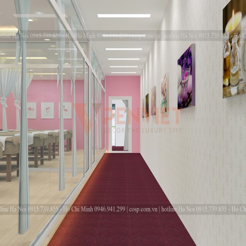Spa là nơi giải tỏa căng thẳng, nghỉ dưỡng cơ thể bởi vậy mà yếu tố không gian luôn trở thành tiêu chí để khách hàng đánh giá và lựa chọn cửa hàng khi muốn gửi gắm nhu cầu của mình. Lối đi giữa các phòng dịch vụ được trải thảm đỏ nổi bật với sơn tường trắng hoa văn nhỏ. Vách ngăn kính hiện đại tạo cảm giác rộng rãi và thoáng mát cho mỗi khách hàng trải nghiệm dịch vụ tại đây.