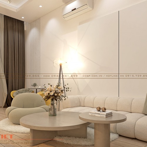 Tiếp đến là khu vực đặt bộ bàn ghế sofa hiện đại khung gỗ bọc nỉ gam màu kem. Bàn sofa làm từ gỗ MDF với thiết kế 2 bàn lớn nhỏ đan xen ấn tượng và hiện đại. Mẫu bàn ghế sofa này được PenViet sản xuất riêng tạo nên sự độc đáo, dấu ấn riêng cho sảnh spa của chị Duyên.