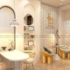 Khu vực sảnh spa sử dụng cửa kính thủy lực có rèm che tạo sự sang trọng và kín đáo. Toán bộ không gian sử dụng gam màu be kết hợp vàng vừa nhẹ nhàng, vừa nổi bật tạo sự phá cách.
