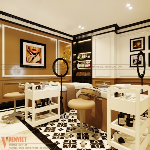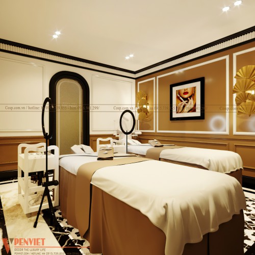 Thiết kế phòng spa sử dụng ánh sáng nhẹ vừa đủ để tạo không gian nhẹ nhàng dễ chịu cho khách hàng. Tông màu chủ đạo bao gồm 3 màu nâu, trắng và đen. Sự kết hợp khoa học đã được tính toán cẩn trọng mang đến không gian làm đẹp dễ chịu thư thái nhất cho khách hàng.