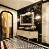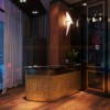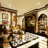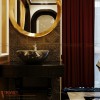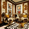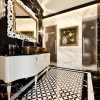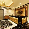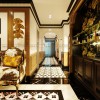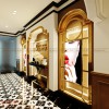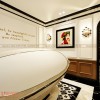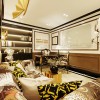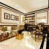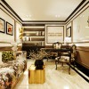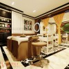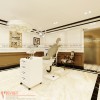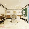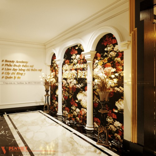 Đi qua phòng khách là tới không gian làm đẹp. Có một khu vực sảnh chờ được thiết kế sang trọng. Bộ bàn ghế nỉ với những hoa văn độc đáo và nổi bật. Bộ đèn tường khá bắt mắt với hình những chiếc quạt, mang lại nét truyền trống bên trong vẻ hiện đại của không gian. Bên cạnh là khu vực quầy thu ngân khá lớn. Bộ bàn được ốp đá và những đường nét nổi màu vàng toát nên sự chuyên nghiệp và sang trọng. Một thiết kế spa đẹp với tường của sảnh khá ấn tượng và tạo điểm nhấn cho không gian. Với khung tường tạo vòm và được vẽ rất nhiều loại hoa.
