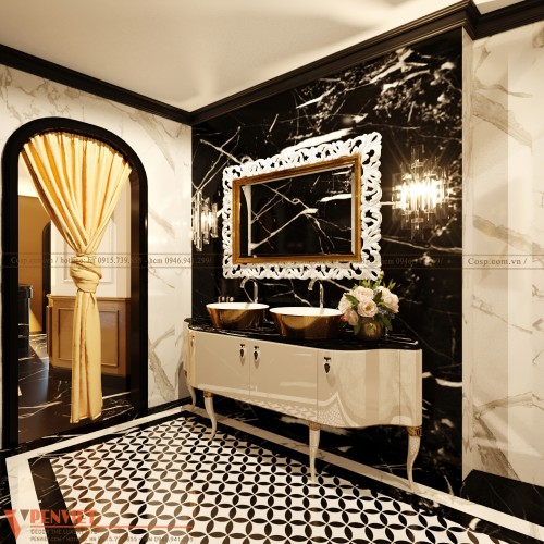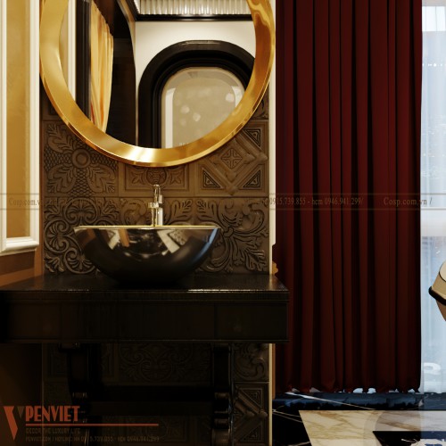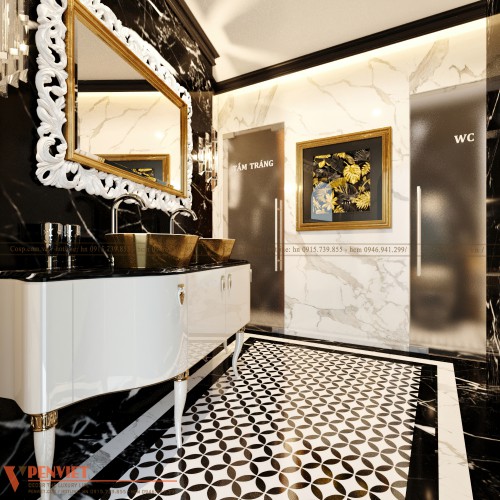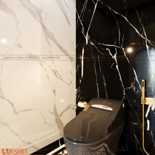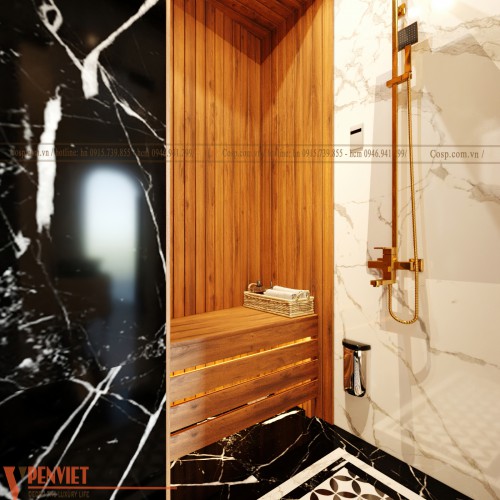 Đến cả khu vệ sinh cũng được thiết kế tỉ mỉ và đẹp mắt. Cửa phòng bằng nhôm kính xingfa, các thiết bị cho phòng cùng được lựa chọn những loại cao cấp nhất và màu sắc tương đồng với không gian.