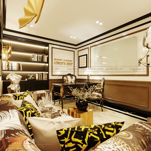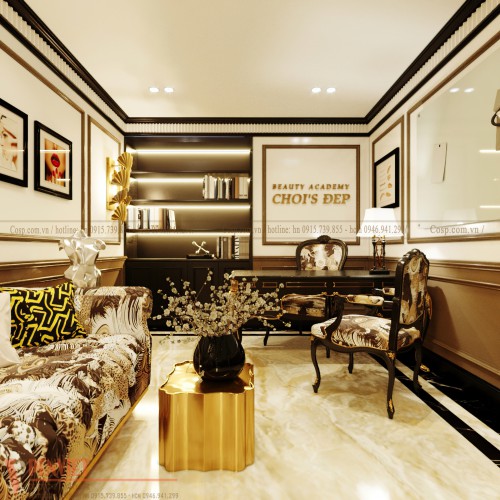 Ngoài phòng khách, phòng spa thì không thể thiếu không gian cho phòng tư vấn. Kiểu thiết kế vẫn động bộ với các không gian khác. Bộ bàn ghế bằng gỗ được thiết kế cầu kì và sang trọng. Điểm trên tường là dòng chữ mica “ Beauty Academy Choi’s Đẹp” không phát sáng. Đến với mỗi không gian, khách hàng đều cảm nhận được sự uy tín và chuyên nghiệp của tiệm spa mang lại.