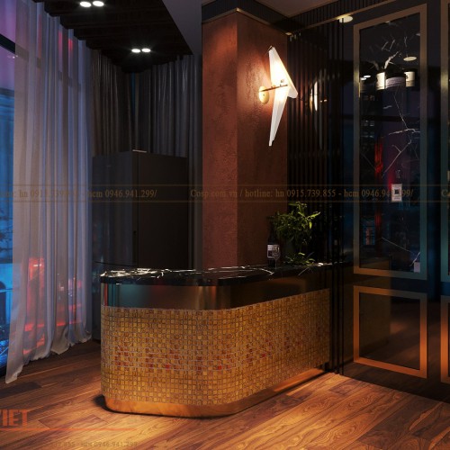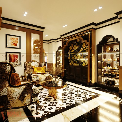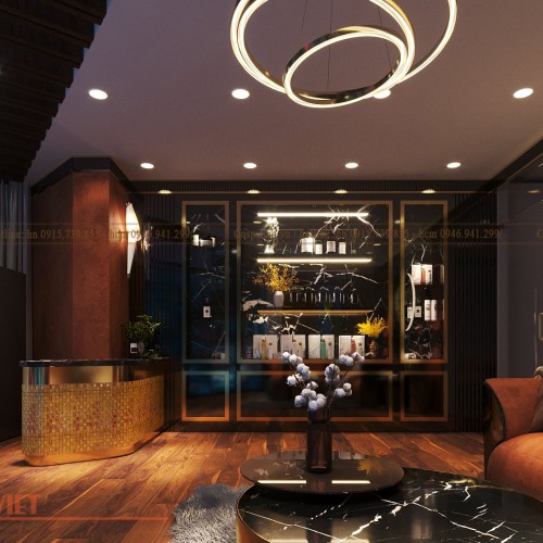 Phòng khách được lát sàn bằng gỗ công nghiệp Melamine màu như ảnh 3D mọi người có thể thấy. Đây là nơi đón tiếp khách hàng nên được các KTS rất chú trọng trong thiết kế. Không gian phòng mang một nét cổ điển pha chút hiện đại. Cửa ra vào là cửa kính cường lực 10ly. Bộ quầy được lựa chọn bàn rất nổi bật với viền xung quanh mạ màu vàng bóng với họa tiết nổi. Bên cạnh là bộ ghế sofa bằng nì dày cao cấp. Thiết kế spa với không gian phòng khách chủ yếu là tone màu trầm nên tạo nét ấm cúng và huyền bí khi có ánh đèn điện.