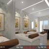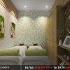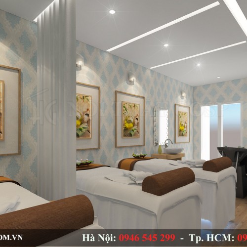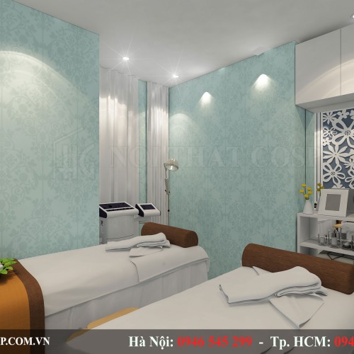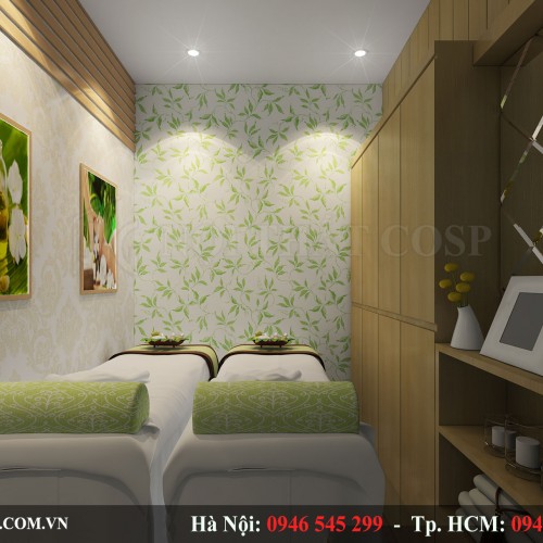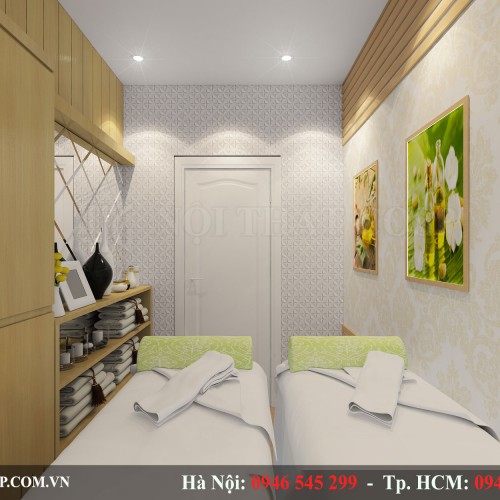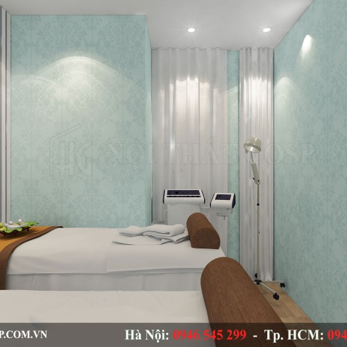 Tiếp đến là phòng massage, phòng massage được thiết kế theo tông chủ đạo là màu trắng được kết hợp cùng giấy dán tường trắng hoa văn xanh nhẹ. Các kệ trưng bày được được thiết kế với chất liệu bằng gỗ mdf sơn, gỗ lamilate được trải qua nhiều quá trình xử lý, biến tấu để phù hợp với không gian và thiết bị bên trong phòng.