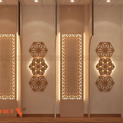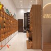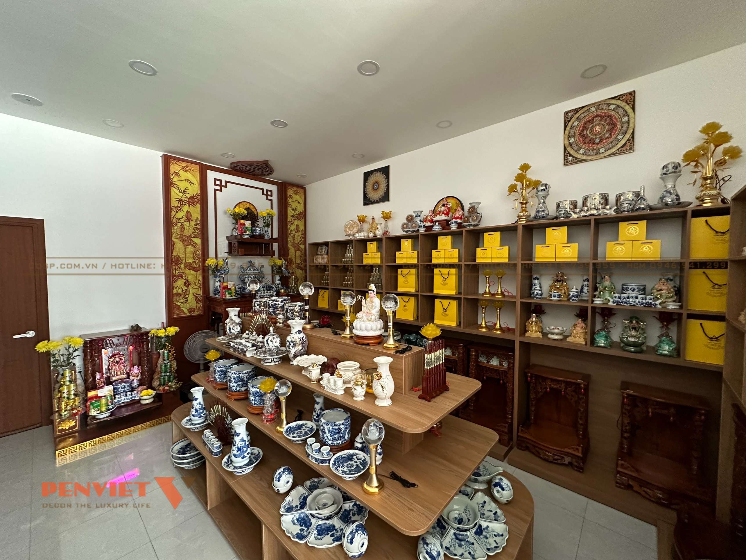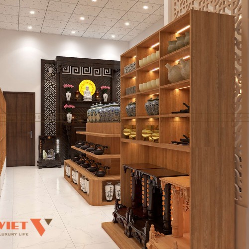 Điểm nhấn màu gỗ tạo sự thân thiện giúp tâm trạng khách hàng trở nên thư thái, dễ chịu hơn khi mua sắm. Gam màu gỗ nâu vàng ấm áp này còn phù hợp với các đồ thờ cúng Phật giáo linh thiêng.