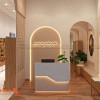 Vách logo thu hút người nhìn với bộ chữ thương hiệu và tên logo chất liệu inox phát sáng chân. Hơn nữa, thiết kế vách thạch cao uốn vòm cùng đèn LED hắt viền tạo sự mềm mại và nổi bật. Với cách setup này sẽ làm tăng độ nhận diện thương hiệu của spa trong mắt khách hàng khi đến trải nghiệm dịch vụ.