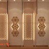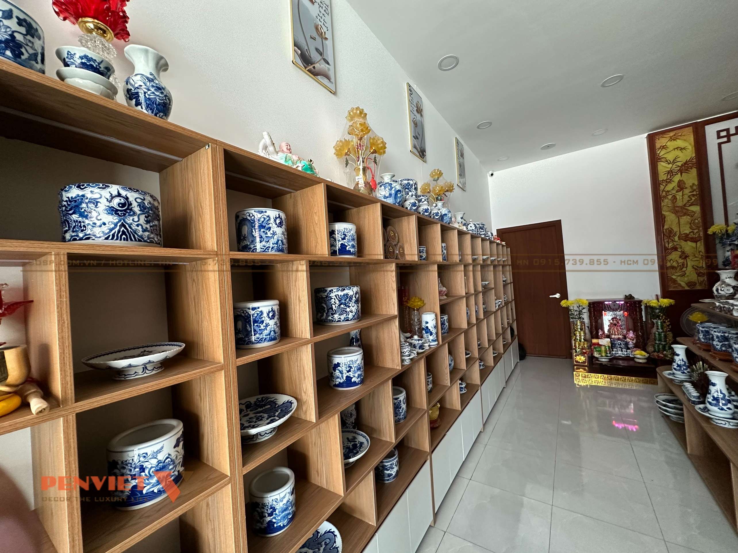 Hệ tủ trưng bày đa dạng kích thước làm từ gỗ MDF phủ melamine với gam màu nâu sáng hiện đại, trẻ trung. Trong các đợt tủ có gắn đèn LED hắt sáng tạo hiệu ứng nổi bật cho sản phẩm thờ cúng Phật Giáo.