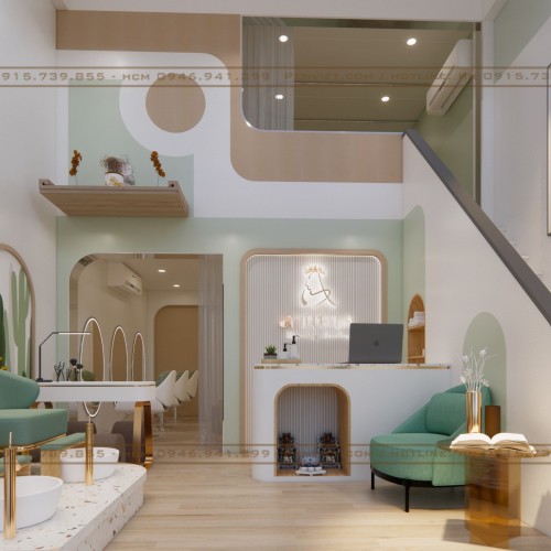 Ngay khu vực tầng trệt bố trí bên phòng ngoài là quầy lễ tân và dịch vụ chăm sóc móng chân. Với tông màu xanh pastel nên không gian spa trở nên vô cùng sang trọng và thoáng đãng. Nội thất gọn gàng nhưng đầy đủ tiện nghi cùng các bức tranh trang trí trên tường tạo điểm nhấn thu hút ánh nhìn.