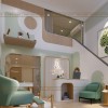 Vách tường có các đường nét uốn lượn mềm mại tạo sự độc đáo cho không gian. Chi tiết trang trí đèn LED theo đường viền góc tường tạo hiệu ứng thị giác mạnh mẽ, làm không gian thêm phần cuốn hút.