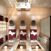 Thiết kế spa 45m2 của chị Tiên gồm có 2 phòng massage chính, đây là phòng massage 1 gồm có 3 giường massage. Các giường spa được làm bằng gỗ tự nhiên với gam màu đỏ nổi bật. Rèm và khăn trải giường của phòng này có màu đỏ rực rỡ, màu sắc nổi bật tiếp thêm năng lượng cho mọi người.