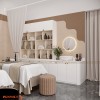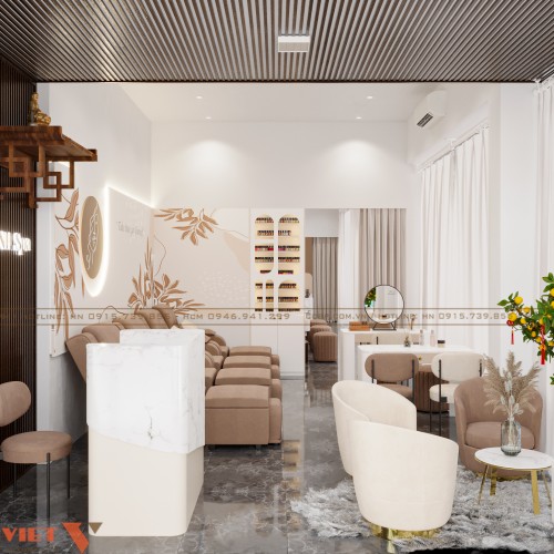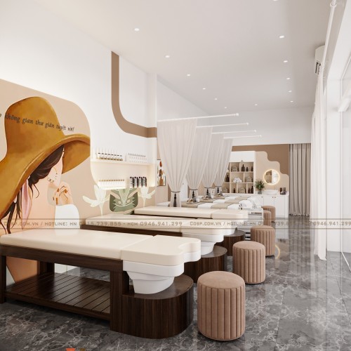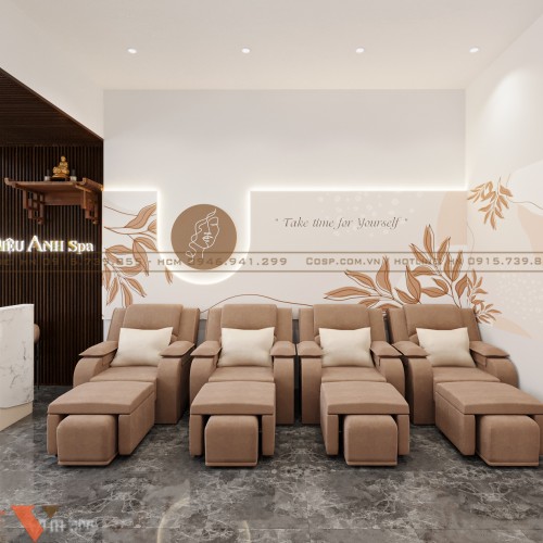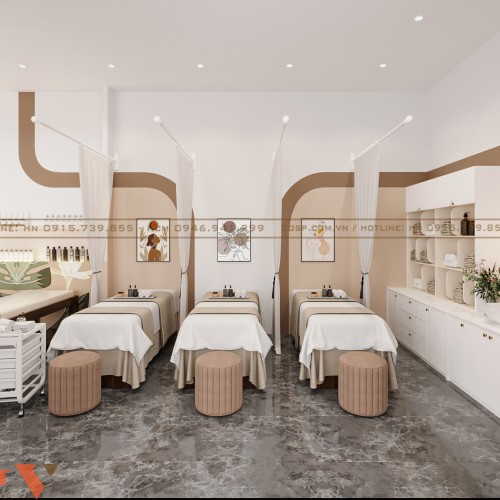 Phong cách thiết kế spa hiện đại chính là phương án thiết kế phù hợp nhất với diện tích khoảng 60m2 và mức đầu tư tài chính của anh Hùng. Màu sắc chủ đạo tone màu nâu kem nhẹ nhàng vừa để phù hợp với hiện trạng cũ của công trình vừa mang đến sự chuyên nghiệp thu hút cho spa.