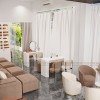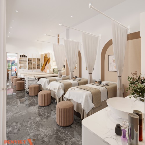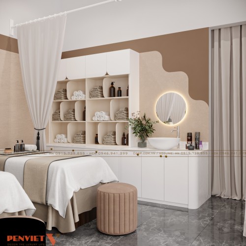 Bằng cách dựng vách ngăn và sử dụng rèm che, Penviet đã khéo léo tận dụng tạo ra khu vực massage body. Đây là phương án tối ưu nhất để phân chia đầy đủ các phòng chức năng cần có đảm bảo của cơ sở làm đẹp này.