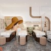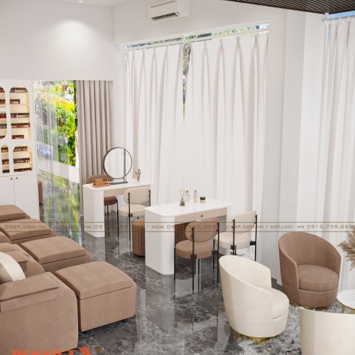 Khu vực chức năng bố trí ghế massage chân và bàn làm nail thành hai dãy song song vừa giúp tận dụng diện tích mang lại cảm giác rộng rãi thông thoáng cũng như tạo thanh lối đi giúp nhân viên và khách hàng thuận tiện trong việc di chuyển.