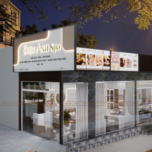 Bộ nhận diện thương hiệu, địa chỉ, thông tin dịch vụ của spa được thể hiện đầy đủ trên biển hiệu mà không hề rối mắt sẽ giúp khách hàng nắm bắt nhanh dịch vụ của spa.