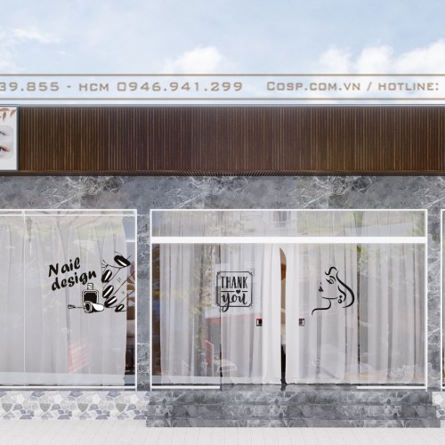 Mặt tiền hông spa sử dụng nhiều tranh ảnh sinh động chủ đều làm đẹp thu hút sự chú ý. Hệ cửa kính cường lực trắng mang đến nguồn ánh sáng tự nhiên chiếu sáng không gian.