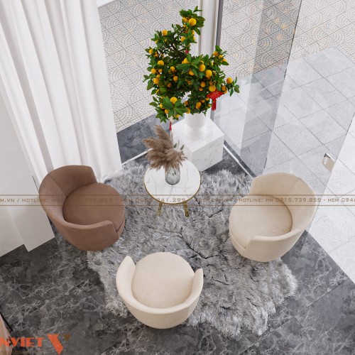 Kiến trúc sư sắp đặt khu vực tư vấn đối diện quầy lễ tân với bộ ghế ngồi bọc nỉ mang đến sự thoải mái cho người sử dụng. Bàn trà kiểu dáng tối giản làm từ Inox được sơn tĩnh điện góp phần tạo nên sự sang trọng, mềm mại cho không gian.