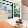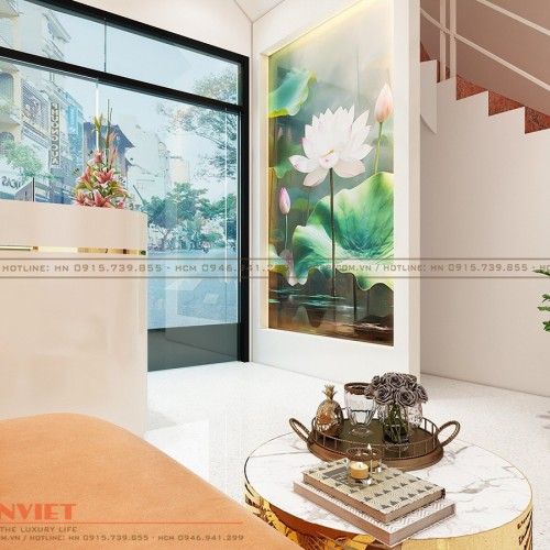 Đối diện quầy lễ tân là vách tranh thạch cao 2 mặt hình hoa sen thanh tịnh, nhẹ nhàng và vô cùng kiêu sa. Vách trang trí này cũng là điểm nhấn nổi bật của spa nhằm thu hút ánh nhìn khashc hàng khi đặt chân vào cửa tiệm.