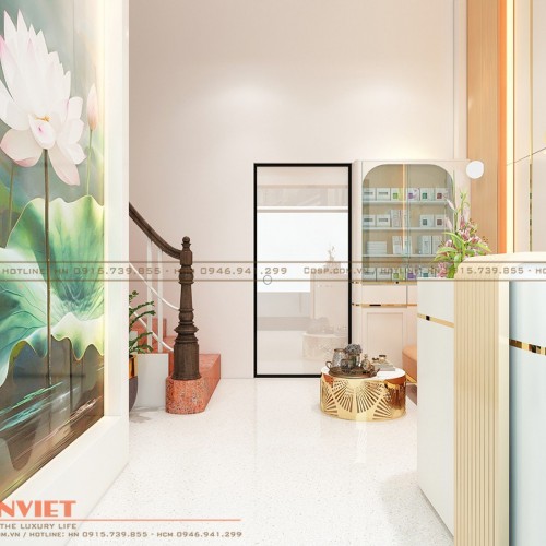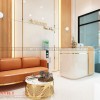 Tiếp đến là khu vực tiếp khách của spa với sự bố trí bàn trà thiết kế đặc biệt khung sơn nhũ vàng cắt họa tiết CNC. Bộ sofa làm từ khung gỗ được bọc da mang đến sự sang trọng cho không gian và cảm giác thoải mái cho người ngồi.