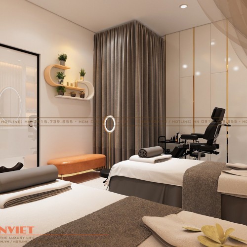 Cuối cùng là phòng chăm sóc sắc đẹp của spa. Để tạo sự đồng bộ cho tổng thể không gian, PenViet cũng sử dụng hệ thống đèn vàng ấm áp cho khu vực này. Mọi chi tiết trang trí được PenViet sử dụng rất tỉ mỉ, tinh tế và hài hòa như tranh in hình cây cỏ, đèn LED hắt sáng…
