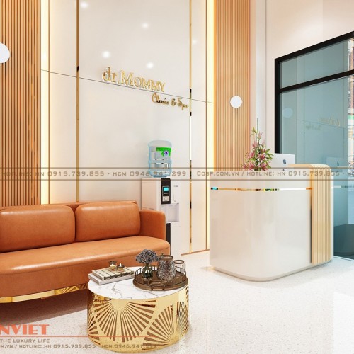 Không gian bên trong spa Dr.Mommy khá thu hút với phong cách nhẹ nhàng, hiện đại. Ngay gần cửa ra vào là quầy lễ tân làm từ gỗ MDF cốt xanh Thái Lan chống ẩm sơn PU cao cấp được bo tròn tạo cảm giác mềm mại cho không gian. Kết hợp thân quầy ốp plawood hoặc MDF soi rãnh tạo hiệu ứng đẹp mắt, thu hút người nhìn.